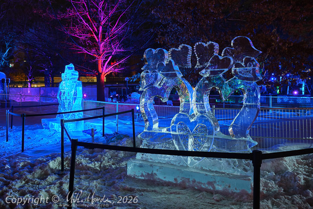 In early February, Emily and I walked over to Confederation Park one evening to view the "Winterlude" festival ice sculpture displays. Many were lit with bright, coloured LED spotlights, however a few were dark, so Emily shone one of my flashlights at those to light up the ice while I took photos, like the Artemis 2 sculpture for example. These photos were all handheld, no tripod, and once again made me very glad I am now shooting a Fujifilm X-E5 with its effective in-body image-stabilization (IBIS), since that helped me keep my ISO down to 400 or less, despite it being fully dark out.